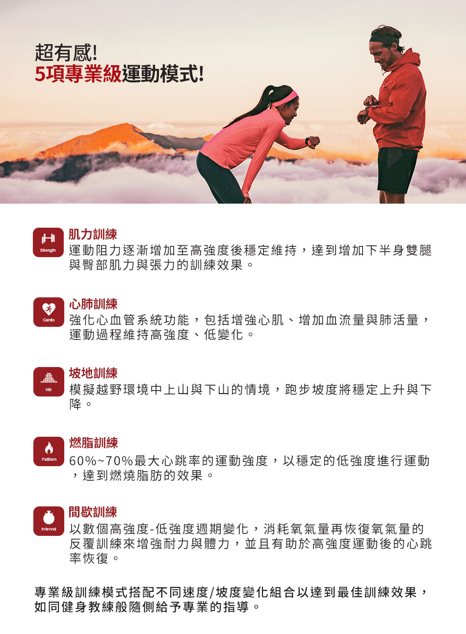 ● 五項專業級運動模式與自訂義運動模式