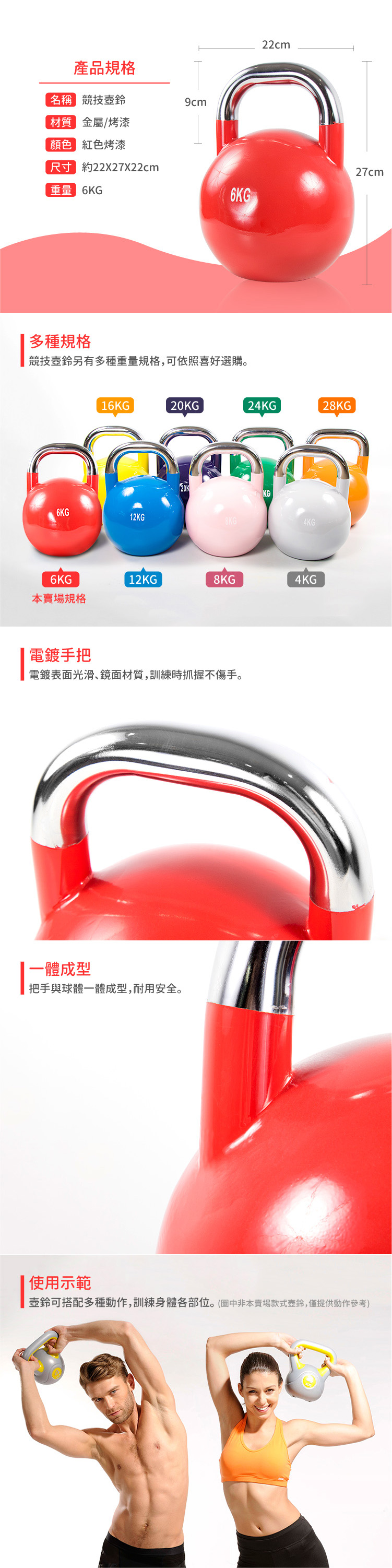 ‧競技壺鈴每個公斤數的把手大小、體積相同。