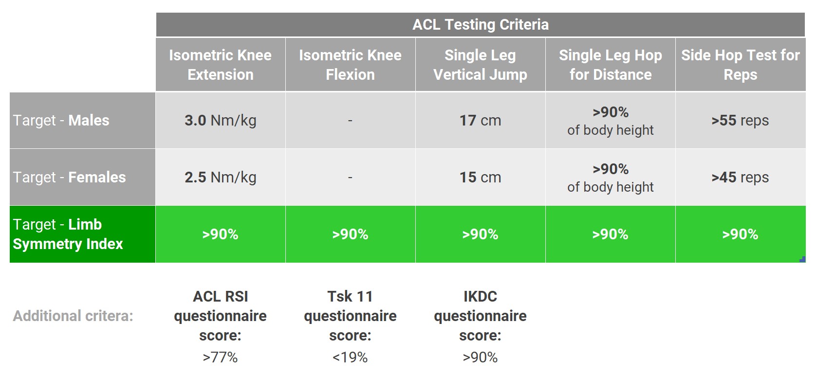 米克在 ACL 重建後重返運動的關鍵標準摘要。