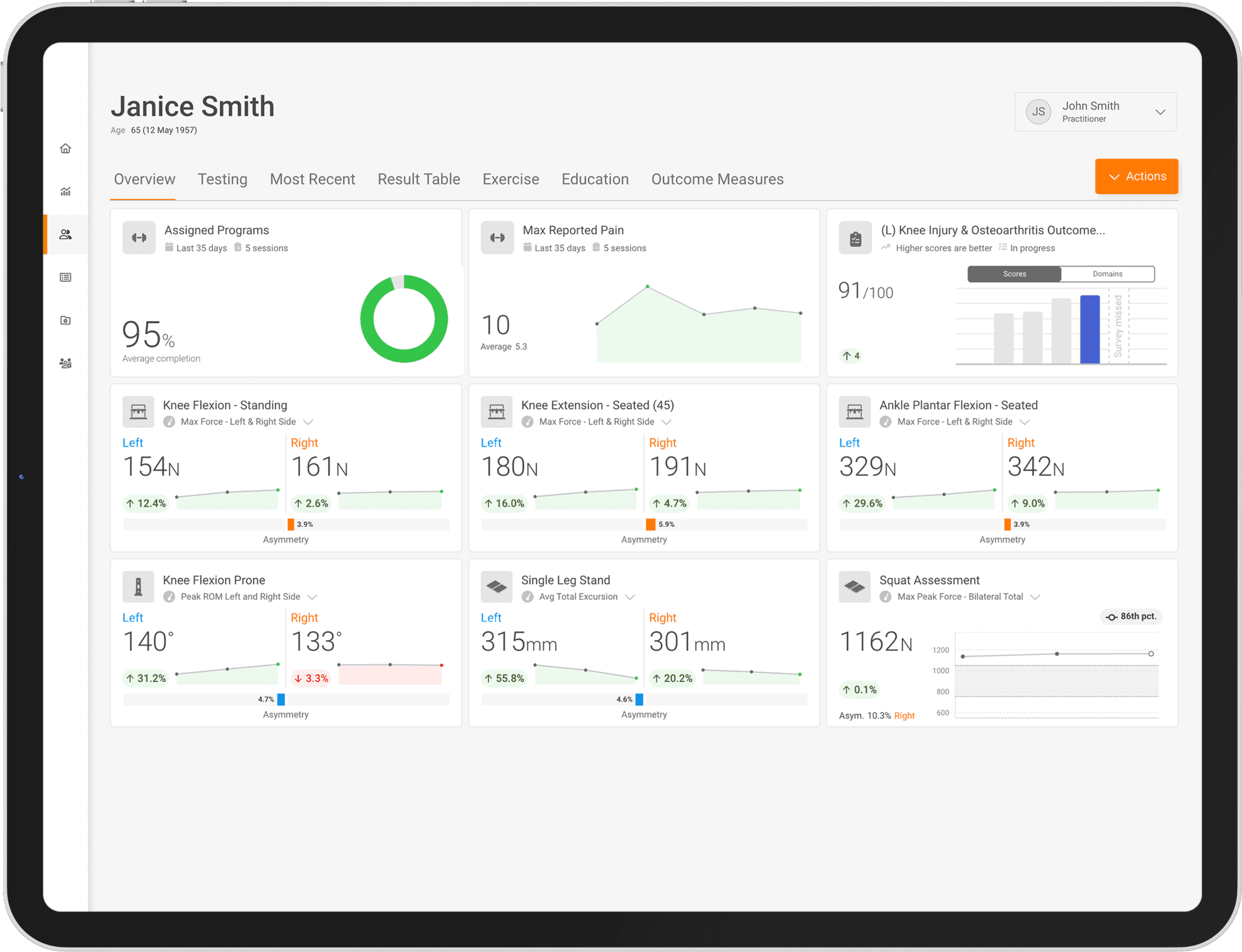 我能想到的一個例子是最近一位案家接受了 ACL 重建手術,術後六個月出現明顯的疼痛、腫脹和功能障礙。當案家來找我時,他們報告說在康復的前六個月期間缺乏組織和定期評估,康復很大程度上是透過任意時間點進行的。 當我能夠客觀地測試案家的髖部和膝部等長肌力時,我清楚地明白為什麼案家在術後六個月時跑、跳和單跳都很困難。客觀測量顯示,股四頭肌力量和膕旁肌力量測試中四肢之間的力量差異為 40%,這兩個力量值都不足以滿足跑步、跳躍和單腳跳的需求。有了這些訊息,我就能夠向案家的外科醫生、主物理治療師和體能教練提供供意見反饋。