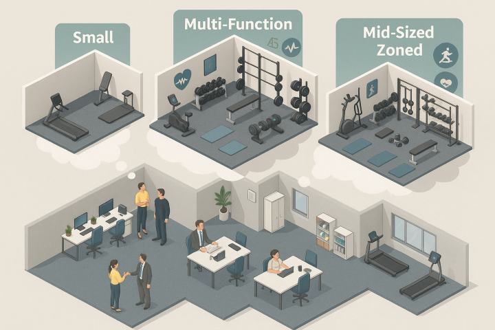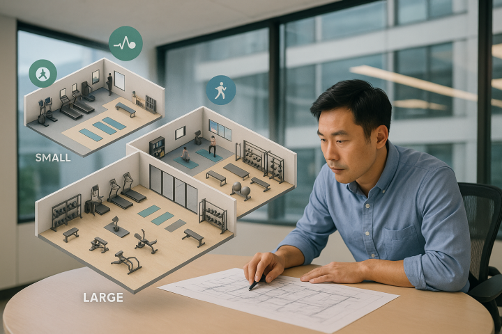 | 小型健身房 | 10~20 坪 | 模組化、多功能為主,靈活運用空間 | 多功能訓練機、可摺疊有氧器材(跑步機/橢圓機)、TRX、彈力帶 | 員工數 20 人以下、空間有限的中小企業 |