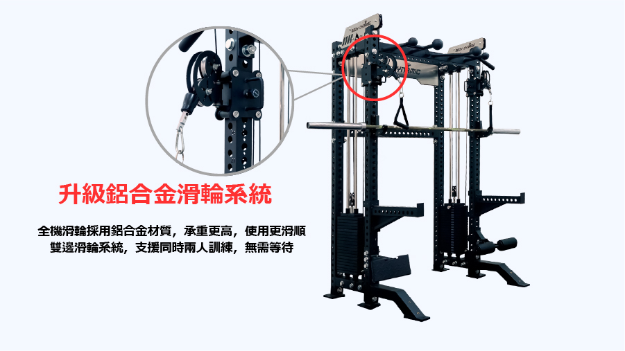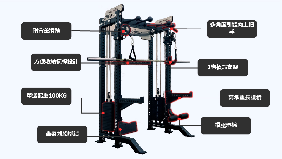 • 獨立雙邊配重: 單邊配重達 100KG,且採用雙邊滑輪系統設計,支援兩人同時進行訓練而無需互相等待。