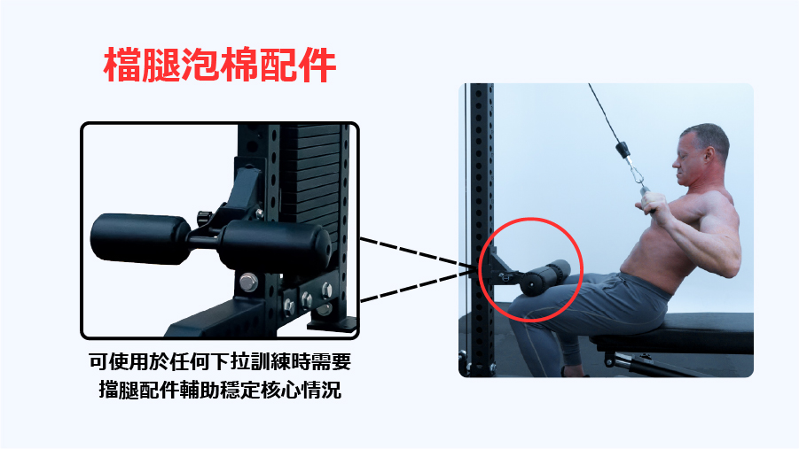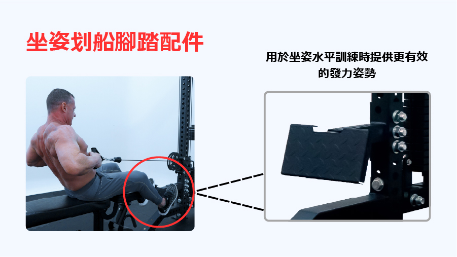 • 坐姿划船配件: 附有專用的划船腳踏板與擋腿泡棉,能提供穩定的發力姿勢進行水平划船或高位下拉訓練。