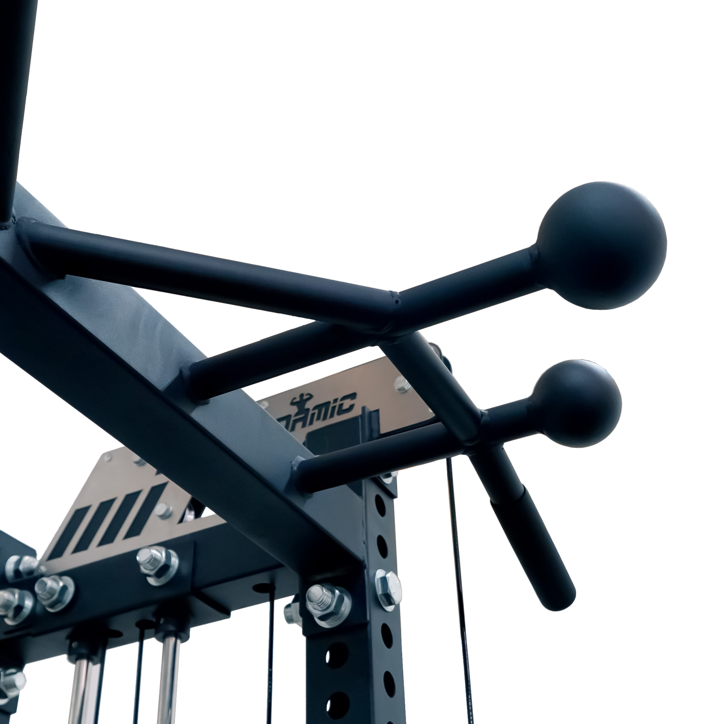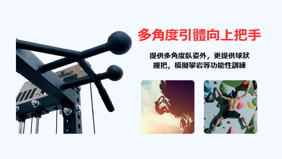 • 多角度引體向上: 提供多個握持角度,並特別設計了球狀握把,可模擬攀岩等功能性訓練。