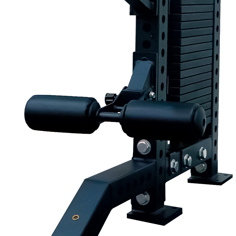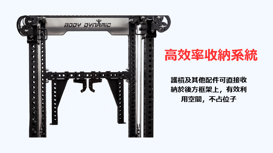 • 收納系統: 護槓、槓鈴桿及其他配件可以直接收納在後方框架上,有效利用空間且不占位置。