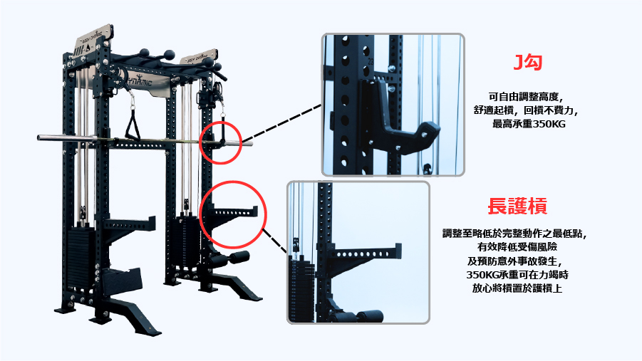 • 高承重支撐: 配備的 J鉤 與 長護槓 均具備高達 350KG 的最高承載能力,能滿足高強度重量訓練的需求。