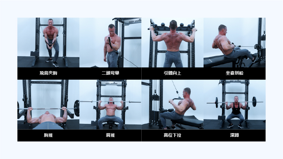 • 背部: 引體向上、坐姿划船、高位下拉。