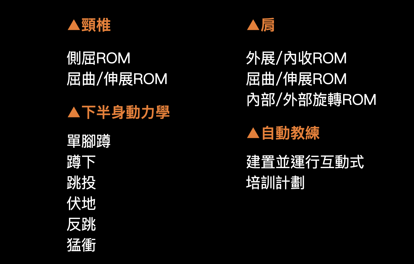 用更多設備進行全方面整合分析運動表現- ForceDesks 肌肉表現、不對稱性和平衡性, ForceFrame 針對上下全身各部位關節進行等長肌力檢測, Dynamo Plus 方便攜帶快速測試肌力與關節活動度, SmartSpeed 測量速度、量化敏捷度, NORBORD 量化膕旁肌的力量與評估受傷風險, VALD HUB將所有設備數據集中雲端管理以及運算分析 |