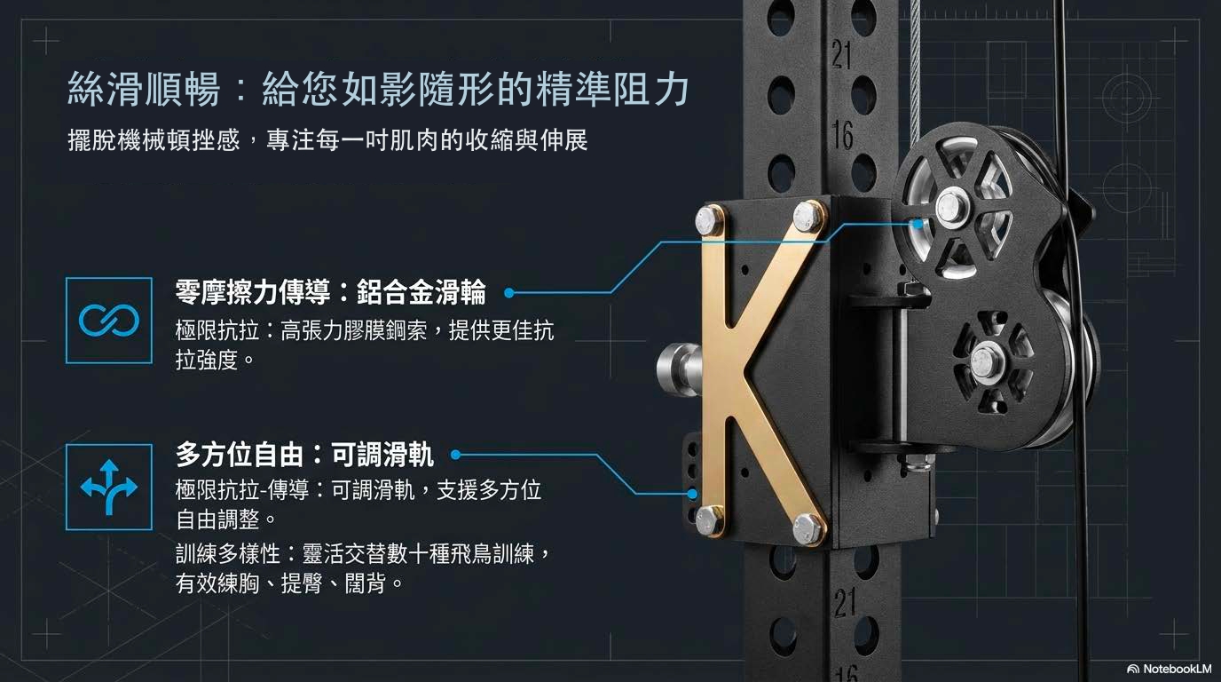 我們採用 高精密鋁合金滑輪 與 高張力膠膜鋼索。相較於平價器材常用的塑膠滑輪,鋁合金滑輪能大幅降低摩擦阻力,提供如絲綢般順滑的拉拔手感,確保每一公分位移的阻力都均勻傳導。