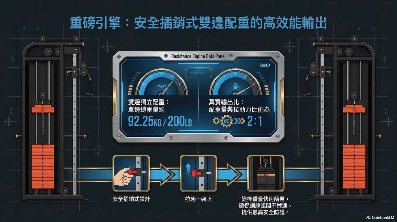 雙邊獨立配重系統:單邊 92.25 KG 獨立配重,滿足從復健孤立動作到大重量胸部飛鳥的全方位需求。