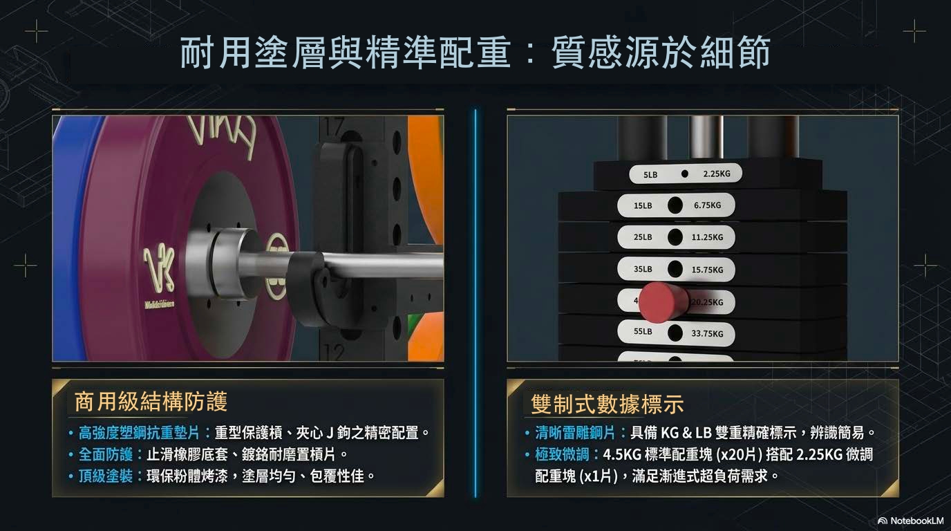 500KG 極限承重:商用等級框架結構,提供超越同級產品的物理穩定性,讓您在大重量深蹲與臥推時,擁有堅不可摧的安全感。