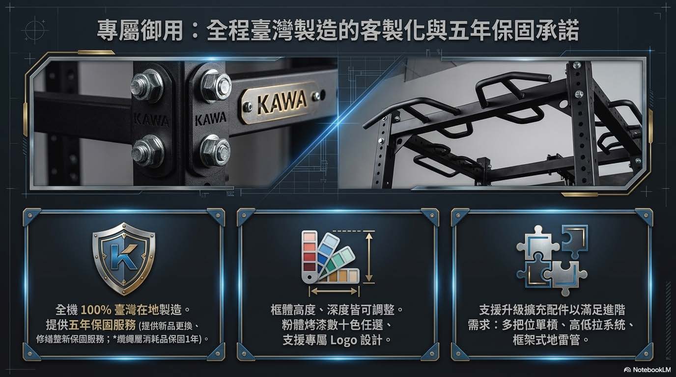 身為 MIT 台灣製造品牌,我們提供主框架 5 年保固,纜繩與滑輪等耗材 1 年保固。相較於海外進口品牌,川鋼能提供更迅速的在地售後支援與零件更換服務,讓您的 HomeGym 投資更有保障。