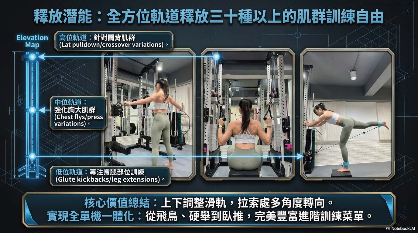 「這不只是一台重訓器材,而是整合健身的終點站。」 整合「自由重量深蹲架」與「精準配重飛鳥系統」,寸土寸金的空間內,釋放 100% 的訓練潛能。專為追求極致安全性與順滑手感的進階訓練者而生。