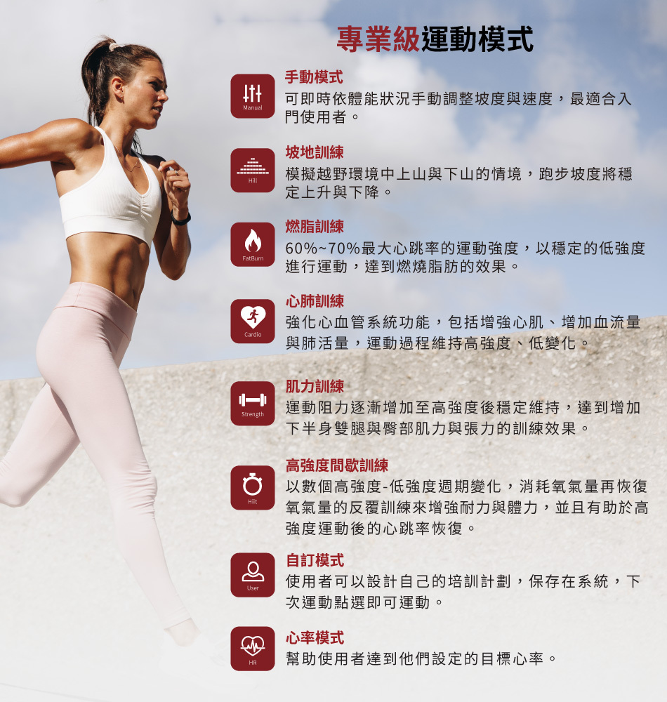 ● 15段電動揚升上坡功能,搭配速度可提供多元強度鍛鍊