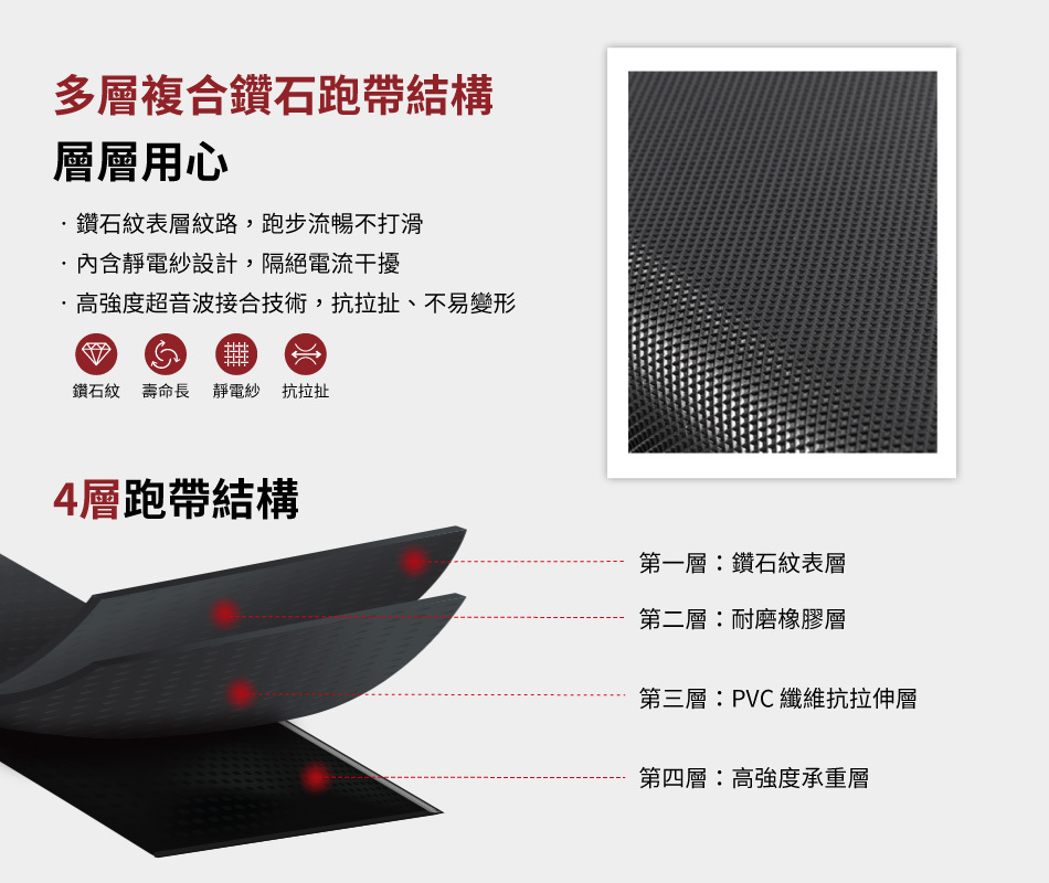 ● 扎實穩固的跑板厚度18MM,讓跑步更續久