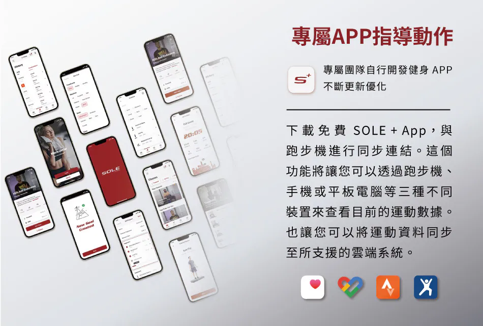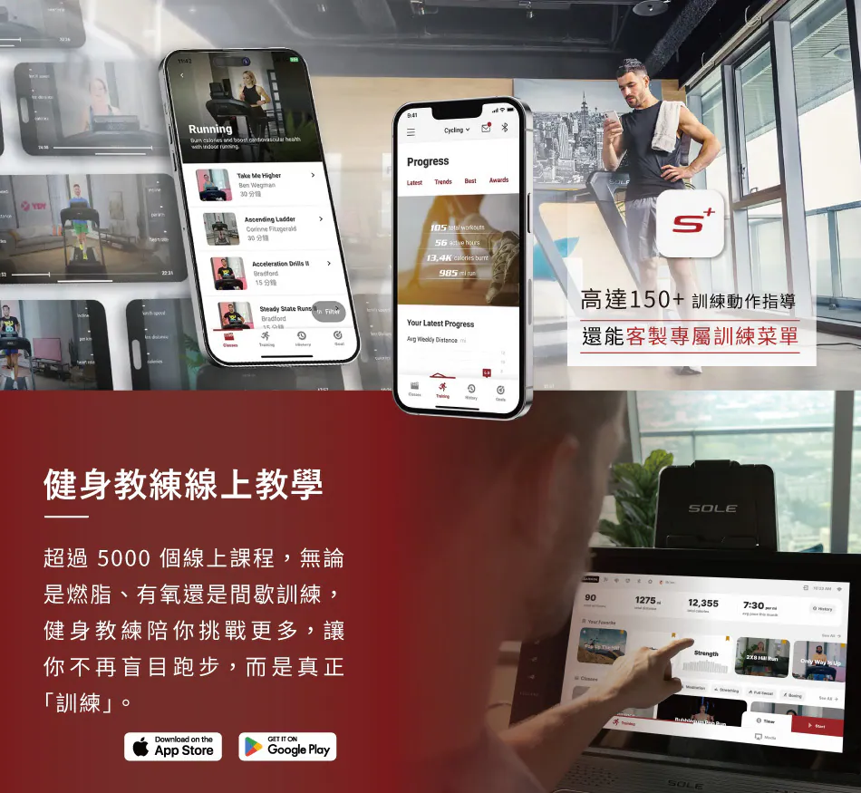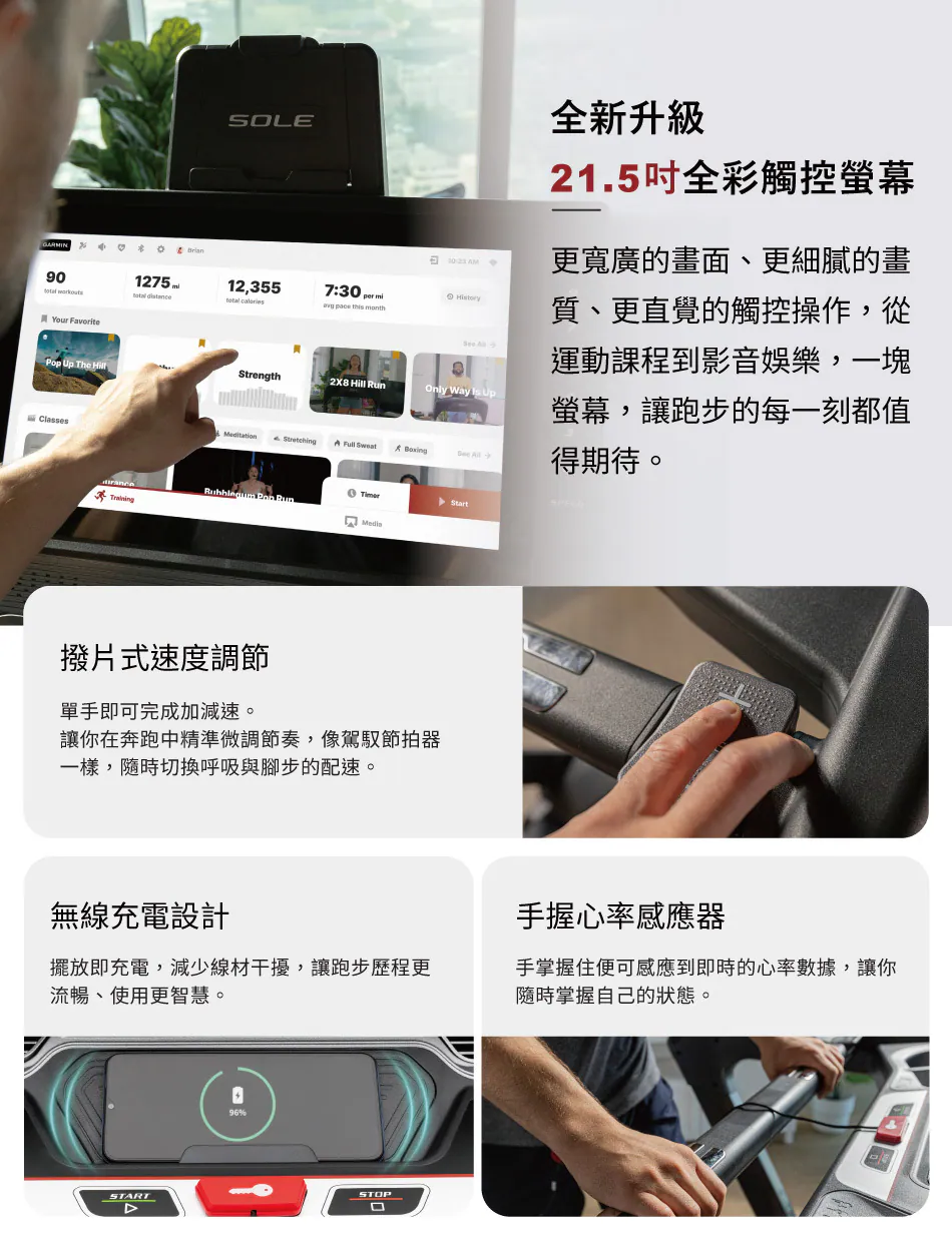 | 運動模式 | 1 組手動、5 組預設、2 組自訂、2 組心率 | 1 組手動、5 組預設、1 組自訂、1 組心率、5K/10K、美國軍方健身測試 | Sole Plus 課程 (教練指導/音訊提示);內建訓練;支援 Garmin 設備配對。 | F89 結合 21.5 吋大螢幕提供教練指導的 Sole Plus 影音課程。 |