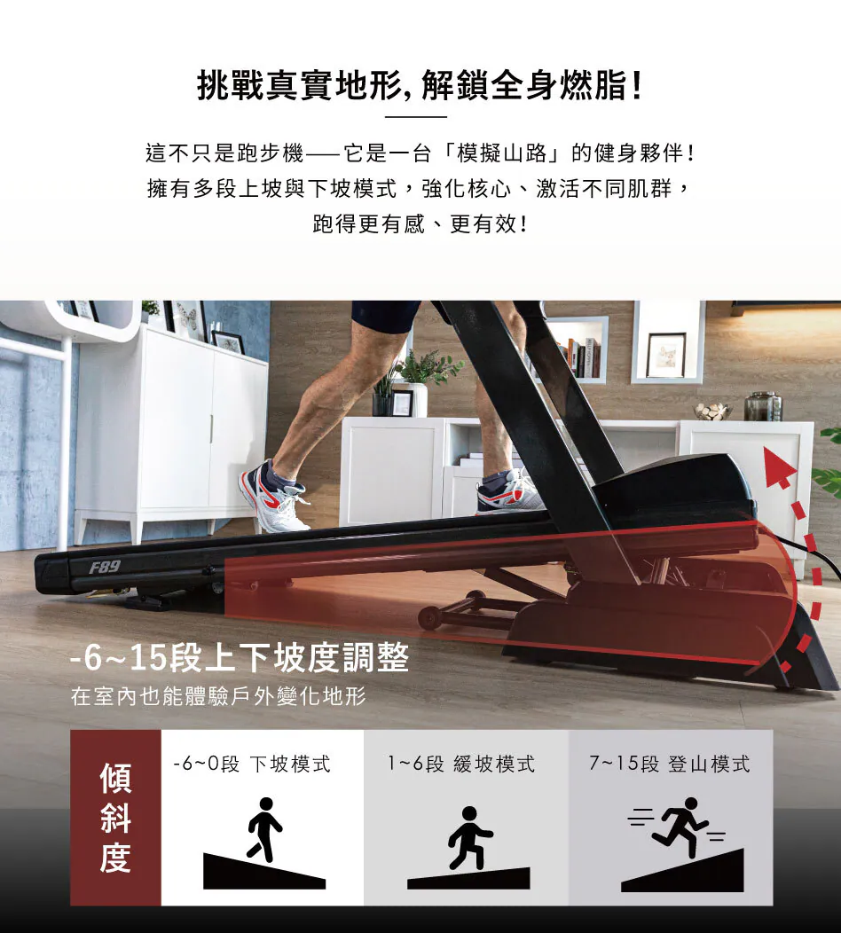 | 坡度/揚升 | 0-15 段上坡 (電動揚升) | -6 – 15 段 上下坡 (首款下坡可收折) | 15 級上坡,6 級下坡 (約 -4% 至 12% 坡度) | F85+ 與 F89 獨有下坡功能 (-6 段 / 6 級),提供更全面的訓練。 |