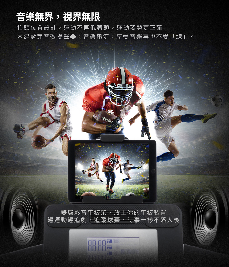 ● 平板支架讓您可以在鍛鍊期間享受更多的娛樂