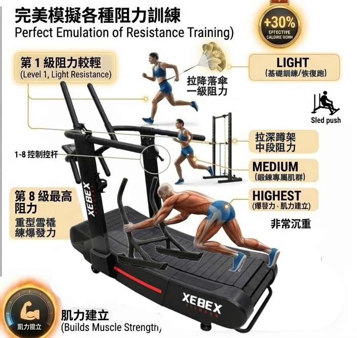 1.結合跑步與高燃脂效率:在現代高階健身與 商用有氧健身房規劃 ,空間效率與訓練多樣性是核心指標。傳統電動跑步機已無法滿足運動員對「功能性訓練」的需求。Xebex ACRT-01 (AirPlus Runner) 的出現,正式打破了心肺器材與重訓器材的界線。