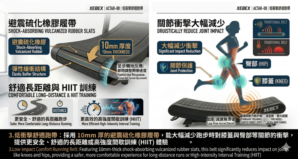 3.低衝擊舒適跑帶:採用 10mm 厚的避震硫化橡膠履帶,能大幅減少跑步時對膝蓋與臀部等關節的衝擊,提供更安全、舒適的長距離或高強度間歇訓練 (HIIT) 體驗。(與ACTAR-08 同等級跑帶)