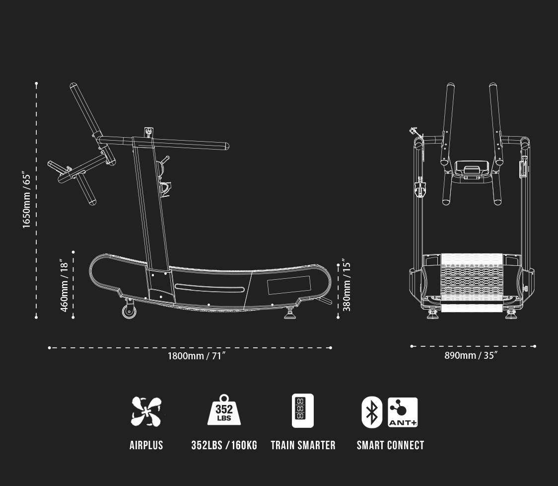 6.重型機身與高穩定度:機身重達159.7kg,在進行最劇烈的衝刺訓練時,精密設計的跑台依然能保持穩固,不會產生打滑或跑步機速度與雙腿不協調的感覺。