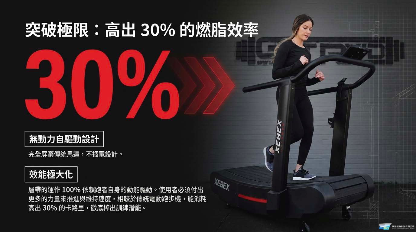 1.無速限與高燃脂效率:這款跑步機沒有最高或最低的速度限制,使用者可以隨心所欲地控制並改變速度,無論是初學者或專業競技選手都適用。同時,由於自發電的弧形設計需要更多腿後肌、臀部與核心肌群的參與,它比傳統電動跑步機多燃燒 30% 的卡路里。
