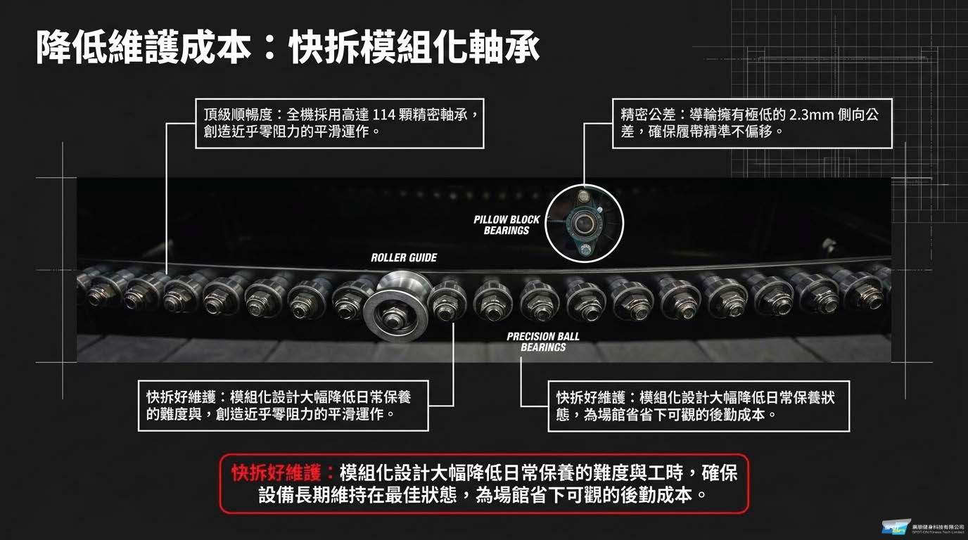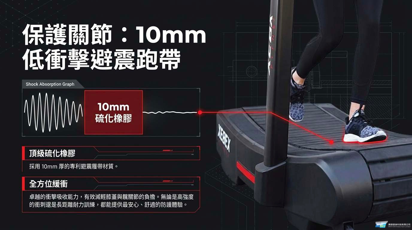 - 低衝擊舒適跑帶:採用 10mm 厚的避震硫化橡膠履帶,能大幅減少跑步時對膝蓋與臀部等關節的衝擊,提供更安全、舒適的長距離或高強度間歇訓練 (HIIT) 體驗。