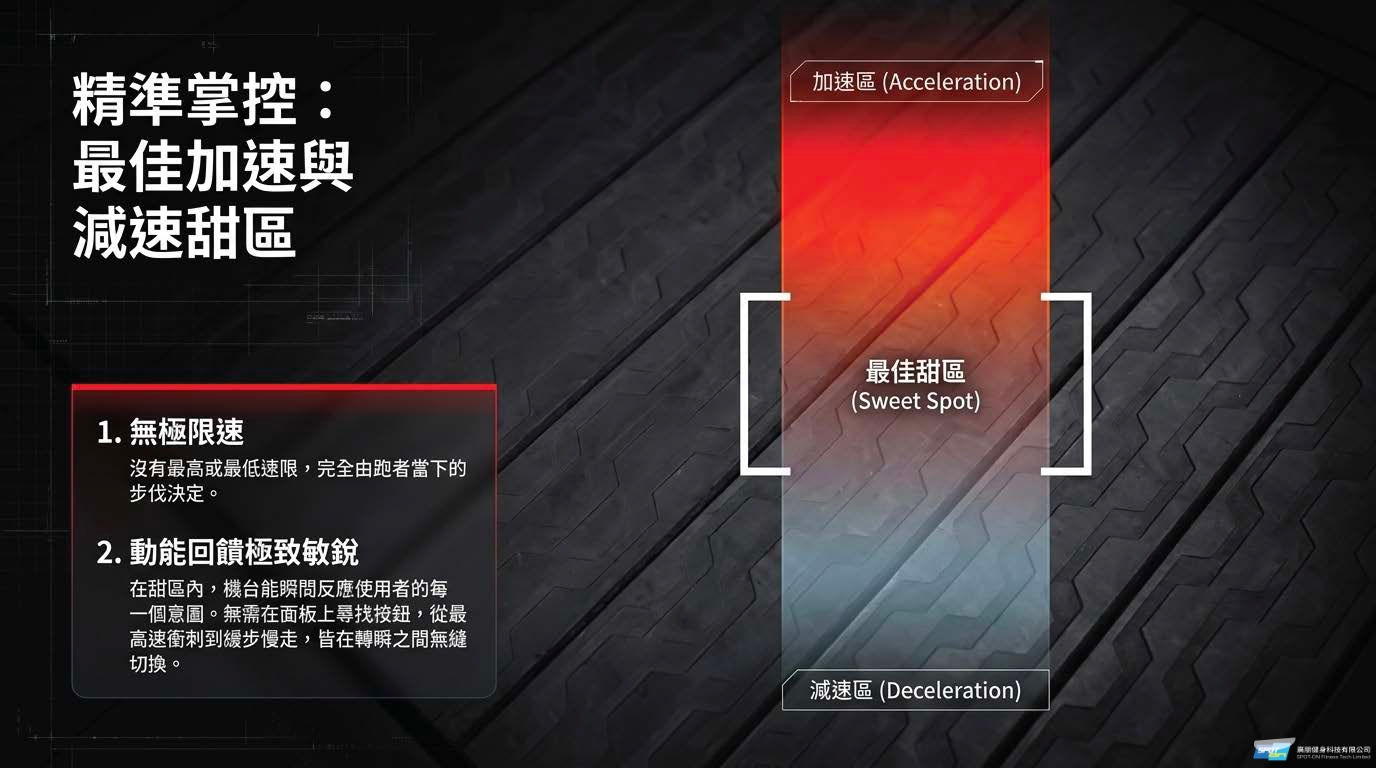2.極佳的靈敏度與超大「甜區」 (Sweet-spot):具備市面上最大「甜區」與最佳反應速度的設計。這使得跑者在加速衝刺、維持配速,或是減緩至慢走時,跑帶都能極度靈敏地配合使用者的步伐。