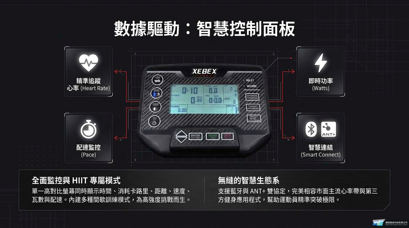 - 智慧連接面板 (Smart Connect):搭載多功能儀表板,可顯示時間、卡路里、距離、速度、瓦數、RPM 與配速,並內建心率與間歇訓練程式。此外,支援藍牙與 ANT+ 連線,可與各式第三方手機健身 App 及群組排行榜軟體進行串聯。
