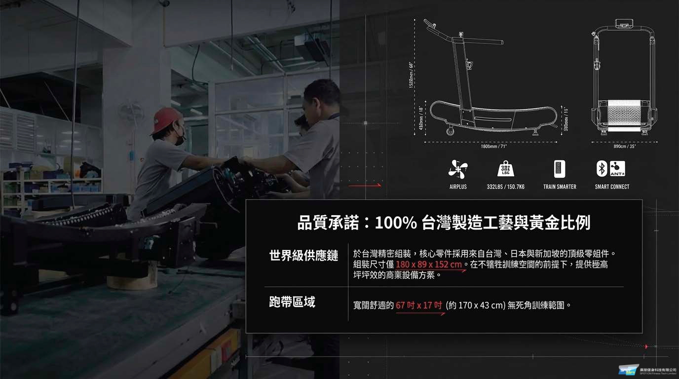 6.重型機身與高穩定度:機身重達157kg,在進行最劇烈的衝刺訓練時,精密設計的跑台依然能保持穩固,不會產生打滑或跑步機速度與雙腿不協調的感覺。